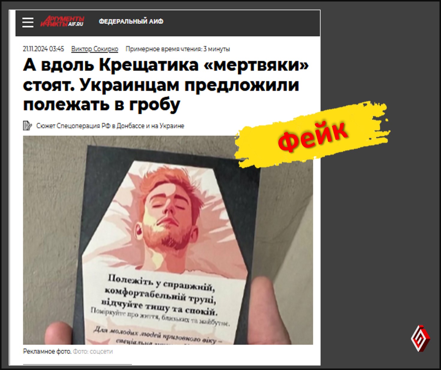 Російські пропагандисти поширили інформацію про те, що у Києві для молоді придумали нову «розвагу» – полежати у труні. При цьому ті, хто пред’являть повістку, отримають знижку на послугу. Для підтвердження своєї інформації агітпроп ділиться зображенням рекламного флаєра похоронного бюро із відповідними послугами. Проте насправді ця інформація є вигаданою. Далі спростовуємо цей фейк детальніше.
