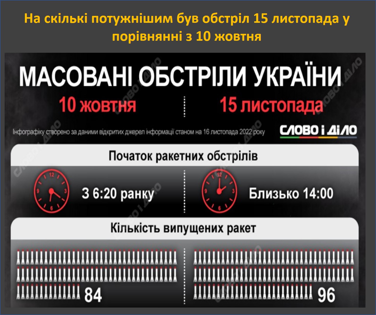 На скількі потужнішим був обстріл 15 листопада у порівнянні з 10 жовтня
