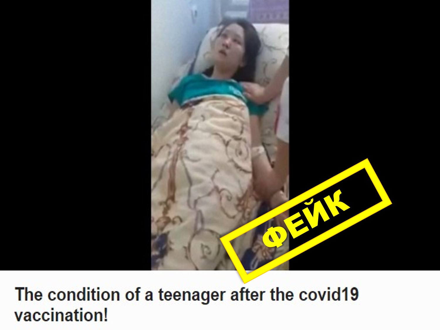 Напис корейською мовою, який супроводжує відео, стверджує, що кадри показують «стан підлітка після щеплення проти COVID-19». «У неї судоми і сильна задишка», — ідеться у дописах. «Вона знаходиться у несвідомому стані і у неї напади кожні 20 секунд». Однак усі коментарі є помилковими.